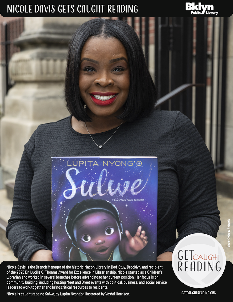 Nicole Davis is the Branch Manager of the historic Macon Library in Bed-Stuy, Brooklyn, and recipient of the 2025 Dr. Lucille C. Thomas Award for Excellence in Librarianship. Nicole started as a Children’s Librarian and worked in several branches before advancing to her current position. Her focus is on community building, including hosting Meet and Greet events with political, business, and social service leaders to work together and bring critical resources to residents. Nicole is caught reading Sulwe, by Lupita Nyong’o; illustrated by Vashti Harrison.